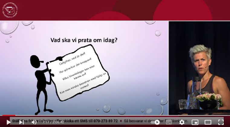 Malin Olofsson, leg. dietist, kommer och berättar om hur magen kan reagera på cellgifter och hur man med hjälp av maten ibland kan minska besvären. Malin jobbar till vardags som dietist vid sjukhuset i Arvika och är ordförande i Dietisternas Riksförbunds sektion inom gastroenterologi och hepatologi.