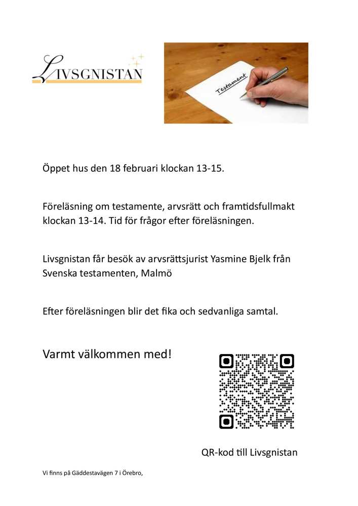 Stafett för livet Föreläsning - Att skriva testamente Den 4 februari 2026 - Världscancerdagen Äntligen dags för Caféträffarna våren 2026 Lite smått och gott från Livsgnistan STYRELSELEDAMÖTER EFTERLYSES God Jul & Gott Nytt År Nyhetsbrev från RCC Mellansverige Julbord - 2025 Blandade inbjudningar från Livsgnistan. Lite blandat från Livsgnistan Rapporter och information, RCC mm. Webinarium m.m. från Livsgnistan Palliativa veckan Livsgnistan - Vi behöver din hjälp Blodcancerdagen - 24/9 Patientsäkerhetsdag - 18/9 Inbjudan webbinarium Cancerstudier i Sverige 250916 Medlemsutflykt ill Alfred Nobels Björkborn i Karlskoga 13 sep. Medlemsresa till Alfred Nobel Karlskoga ÄNTLIGEN - Start för våra Caféträffar Sommarfest med Livsgnistan 250604 - Kvarntorpshögen med Livsgnistan 250603 - Webbinarium för patienter, vårdnadshavare och närstående: Nya uppdragsbeskrivningen för kontaktsjuksköterskor Livsgnistan - Startar Caféträffar i Nora Caféträffen 9/4 INSTÄLLD ÅRSMÖTE - 2025 Livsgnistan - Brev Medicinsk studie CAPSI Livsgnistan - Årsmöte. Tisdag 25 mars 2025 Vårtecken - Caféträffarna startar Webinarium: Patientens självklara roll i framtidens forskning RCC arrangerar lunchwebbinarier Livsgnistan - Terminstart div. aktiviteter som startar nu under vinter/våren 2025 Livsgnistan Julfest Caféträff - Årets sista Temahalvdag om god tand- och munhälsa vid blodcancer 4 dec. Livsgnistan - Vad är Palliativ vård? Julbord - 2024 Livsgnistan - Tipspromenad. Temahalvdag om diagnosen AML - behandlingar & forskning Lite information från styrelsemötet 241112. Föreläsning cancerrehabilitering (1) Livsgnistan - Drabbad av cancer -Samtalsgrupp Caféträffar - Eskilstuna - Hösten 2024 Livsgnistan - Öppet hus 25/9 Kontaktsjuksköterskans roll och uppdrag? Lymfomdagen 13/9 Caféträffar - Örebro -Hösten 2024. Ny logotype Fira sommaren med Funktionsrätt Sörmland Medlemsresa 25 maj - INSTÄLLD p.g.a för få deltagare. ÅRSMÖTE - Blodcancerföreningen 17/4 ÅRSMÖTE Blodcancerföreningen 17 April OBS!! VÄLJ RÄTT ÅRSMÖTE. Livsgnistan - 11/ 4 - Samtalsgrupp för cancerbehandlade Blandat från Livsgnistan. Årsmöte, styrelsemedlem & Fysioterapeut Imformation från Livsgnistan Cafèträff Torshälla våren 2024 Föreläsning cancerrehabilitering Caféträffar våren 2024 - Örebro Vattengympa Lindesberg & USÖ Julbord 2023 - Välkommen till Karlslunds herrgård OSTEOPOROS, benskörhet - Vad är det? 18/10 Kl: 13.00 Viktiga vaccinationer Svenska Kammarorkestern 11/10 Balansträning Caféträffar hösten 2023 2023 års medlemsresa till Eskilstuna Levande bibliotek Sommarfest hos Livsgnistan i Karlslund! TILL DIALOGTRÄFF MED REGIONPOLITIKER Följ med till Kumla sjöpark Livsgnistan - Samtalsgrupp för cancerbehandlade – Någon som vet vad du pratar om! Årsmöte 2023 Information från Livsgnistan Livsgnistan - Dans för hälsa och glädje Caféträffar våren 2023 i Örebro Bildterapi på Livsgnistan Myter och vetenskap kring kosttillskott och cancer Livsgnistan - Samtalsgrupp med bildterapi på Livsgnistan Julfest Livsgnistan 14 dec. Julbord - Myrö slott - 35-års jubileum Livsgnistan - Samtalsgrupp för cancerbehandlade - Någon som vet vad du pratar om! Caféträffar hösten 2022 i Örebro Livsgnistans aktiviteter hösten 2022 35-års jubileum Loka Brunn, 4/9 2022 Livsgnistan - Dan Andersson Cafèträffar våren 2022 Caféträff i Örebro INSTÄLLT! Caféträff i Torshälla. INSTÄLLT! Caféträff i Örebro 7/4 INSTÄLLT! Cafeträff för närstående i Örebro. INSTÄLLT! ÅRSMÖTE 2020 INSTÄLLT! Caféträff i Torshälla 26/3. INSTÄLLT! Caféträff i Karlstad 4 mars 2020 Caféträff i Örebro 3/3 Caféträff i Torshälla 27/2 Cafèträff i Örebro 4/2 Caféträff i Torshälla 30/1 Caféträff 3/9-19 Årsmöte 2019 Caféträff 4/12-18 Höstmöte på Goda Rum i Kumla Caféträff i Örebro 2/10-18 Resa till Karlstad lördag 9:e juni Caféträff i Torshälla/Eskilstuna 27/9-18