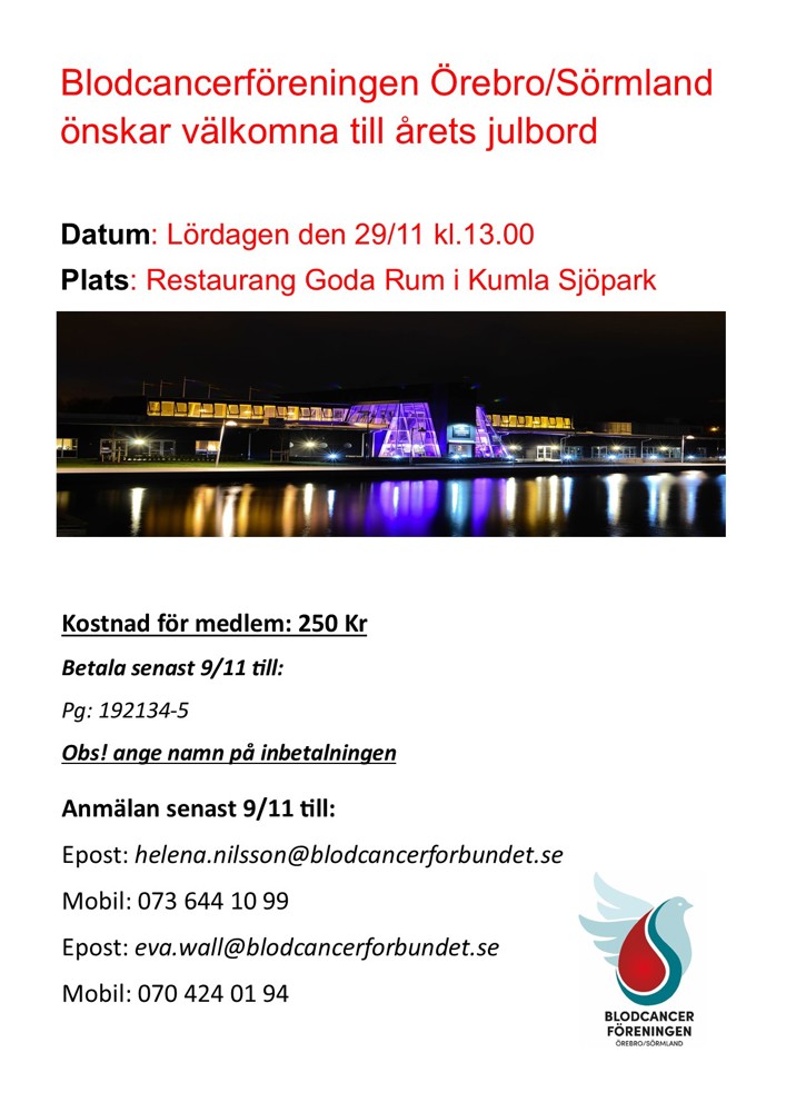 Det drar ihop sig så smått till årets julbord. Goda rum i Kumla sjöpark blir årets plats för att lägra julbordet.Datum: 29/11, kl: 13.00